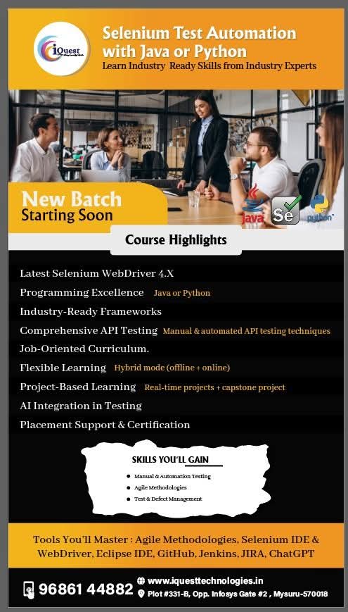 iQuest has given hands-on & Practical training on Python with OOPs Programming skills, Manual Testing, Automation Testing with